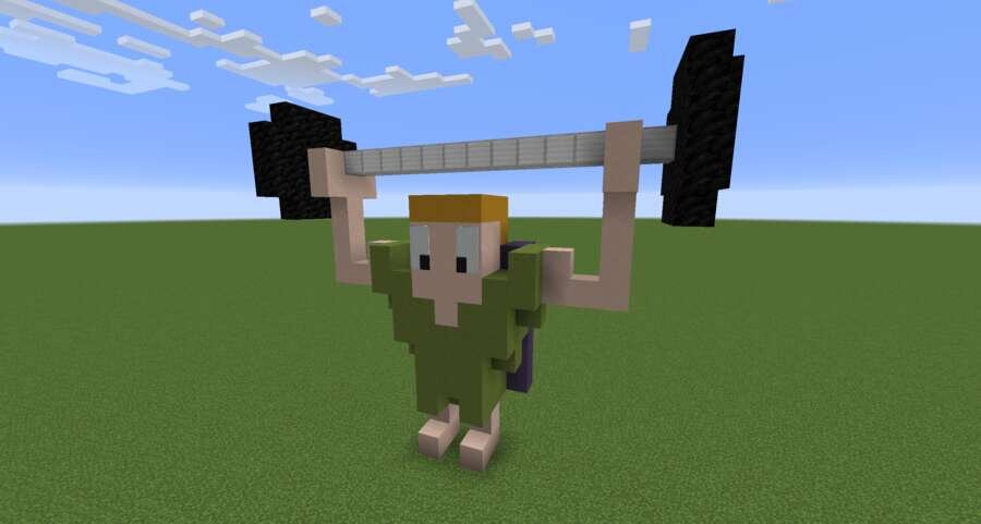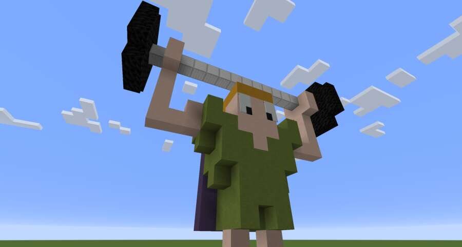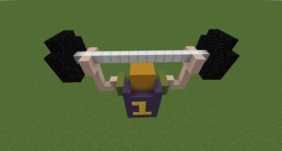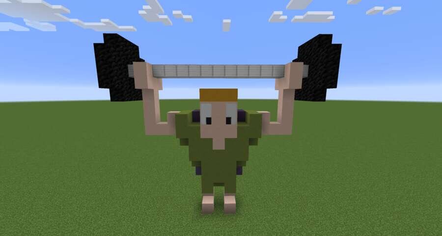 Многие миры отличаются невероятно красивыми постройками и обустройством. В них обязательно есть пиксель арты. Если хотите выделиться, используйте этого здоровяка.Предлагаем пиксель арт большого силача со штангой. Персонаж стоит с поднятыми руками, а на нем есть плащ с единичкой. Герой выполнен в мультяшном стиле, но смотрится красиво.