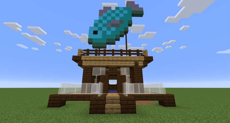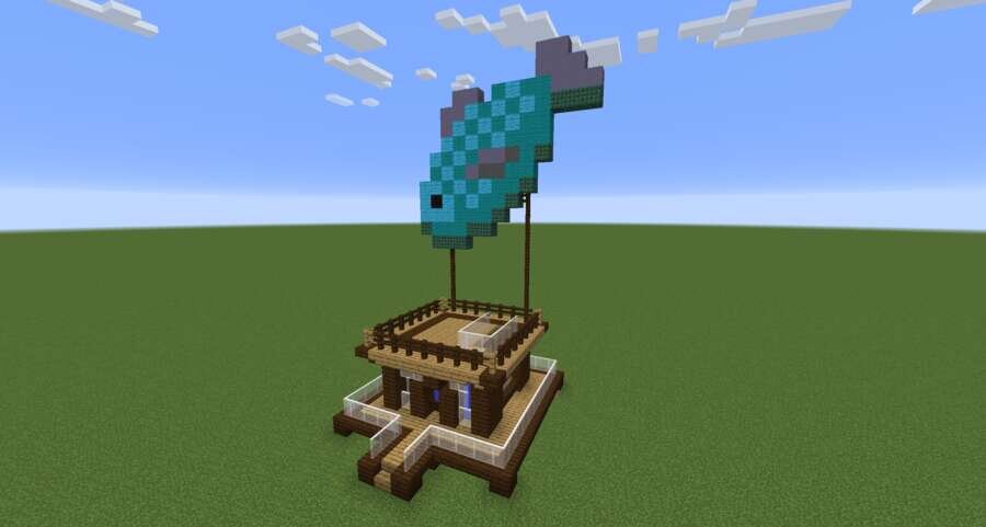 Питомцы занимают важное место в сердцах выживающих. Многие для них строят прямо отдельные домики, как сегодняшний вариант для Майнкрафт.Предлагаем небольшой домик для котика в игре. Нижняя часть сделана из дерева и смотрится очень симпатично. Сверху красуется пиксель арт огромной рыбки.