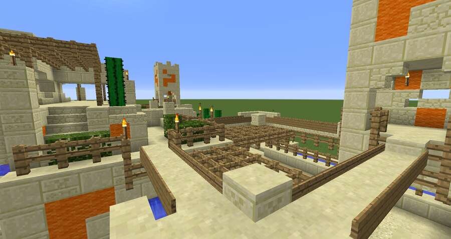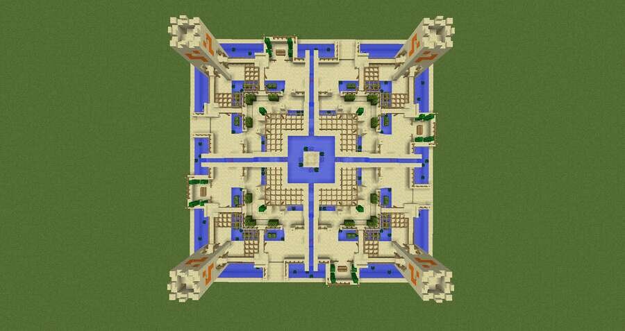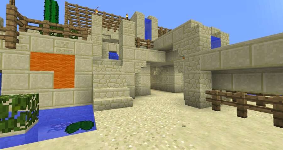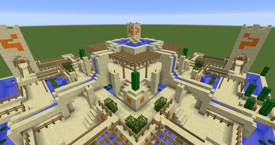 Песочные биомы всегда смотрятся пусто и скучно. Даже так некоторые игроки селятся там и именно в такие моменты можно использовать эту постройку.Предлагаем большой фонтан-оазис для пустынных локаций. Локация достаточно красивая, красочная и водная. Ее можно спокойно поставить рядом с пустынной деревушкой и все будет намного красочнее.